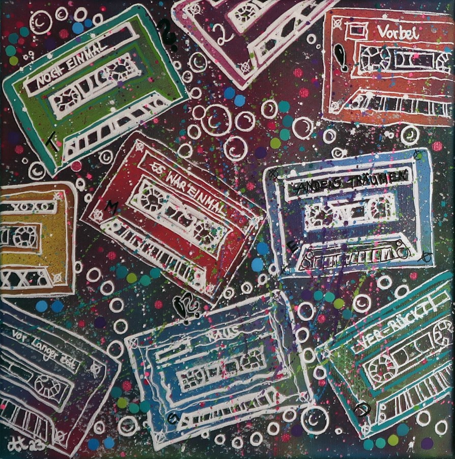 „Erinnerung 1“, 30×30, Acrylfarbe, Acrylstifte, Acrylspray, Glitzerfarbe und Streuglitzer auf schwarzer Leinwand, Preis auf Anfrage.