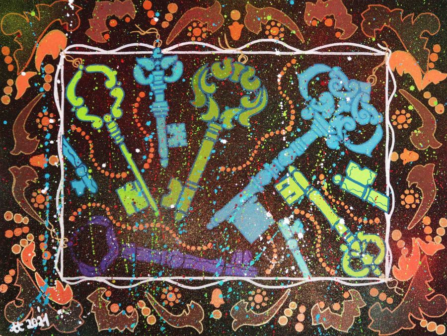 „So mancher Schlüssel zum Glück“, 30×40, Acrylfarbe, Acrylstifte, Acrylspray, Glitzerfarbe und Streuglitzer auf schwarzer Malpappe, Preis auf Anfrage.