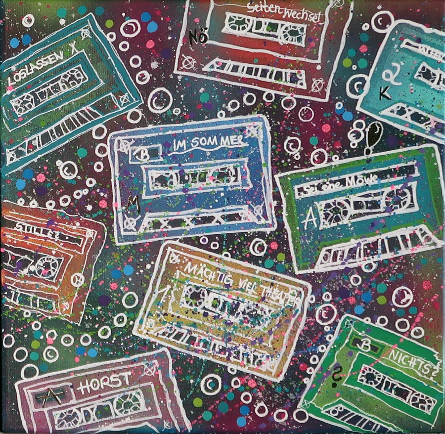 „Erinnerung 3“, 30×30, Acrylfarbe, Acrylstifte, Acrylspray, Glitzerfarbe und Streuglitzer auf schwarzer Leinwand, Preis auf Anfrage.
