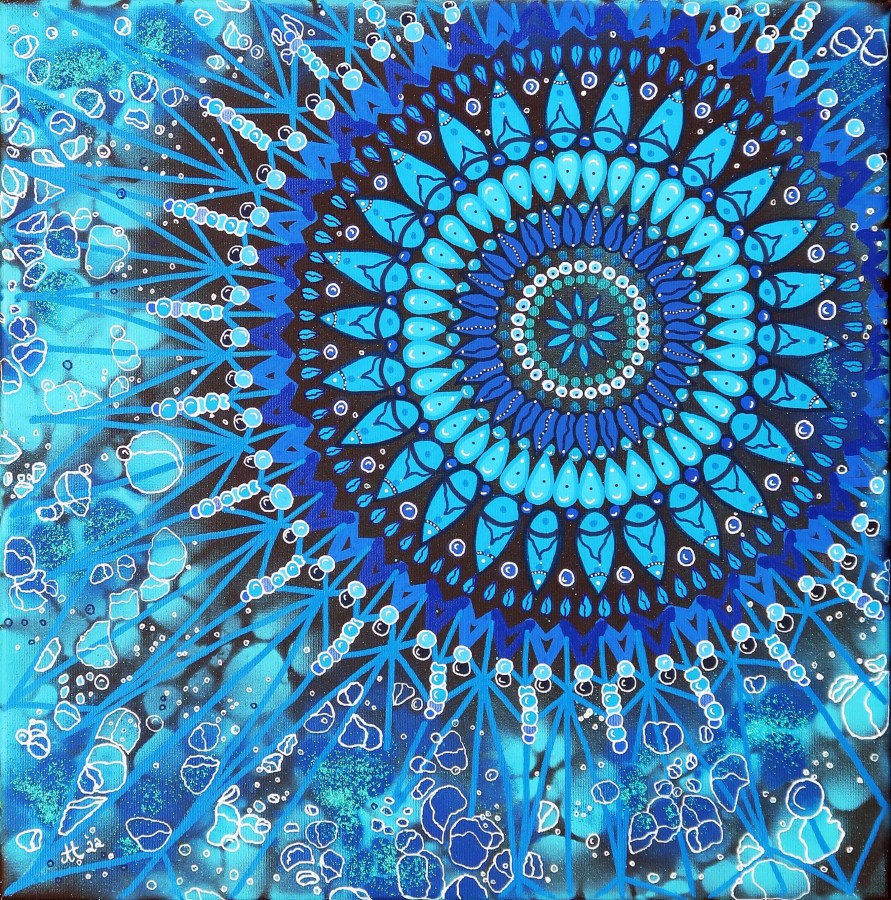 „Blauexplosion“, 40×40, Acrylfarbe, Acrylstifte, Acrylspray, Glitzerfarbe und Streuglitzer auf schwarzer Leinwand, unverkäuflich.