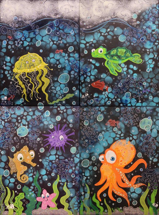 „Der KRAKIGE Horst und seine Freunde“, 4x30x40, Acrylfarbe, Acrylstifte, Acrylspray, Glitzerfarbe und Streuglitzer auf schwarzer Leinwand , Preis auf Anfrage.