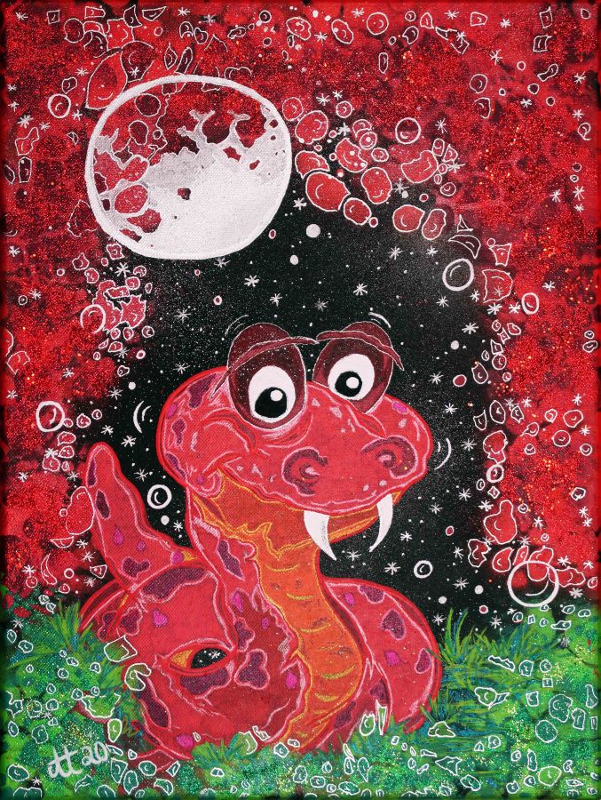 „Luzi Schlängerich“, 30×40, Acrylfarbe, Acrylstifte, Acrylspray, Glitzerfarbe und Streuglitzer auf schwarzer Leinwand , Preis auf Anfrage.