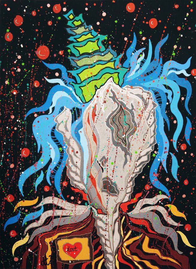 „Das Herz am falschen Fleck 2“, 30×40, Acrylfarbe, Acrylstifte, Acrylspray, Glitzerfarbe und Streuglitzer auf schwarzer Malpappe, Preis auf Anfrage.