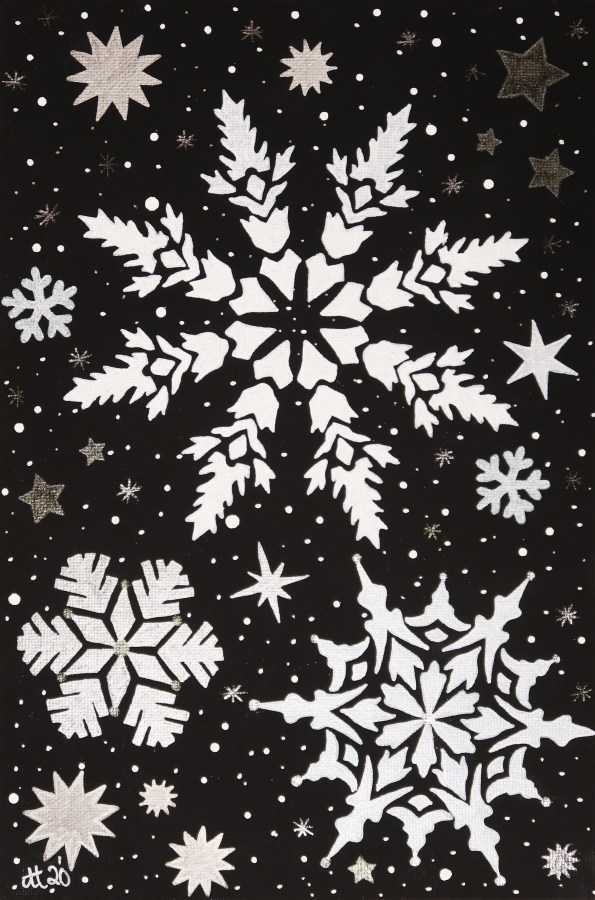 „Etwas Schnee“, 20×30, Acrylfarbe, Acrylstifte, Acrylspray, Glitzerfarbe und Streuglitzer auf schwarzer Malpappe, Preis auf Anfrage.