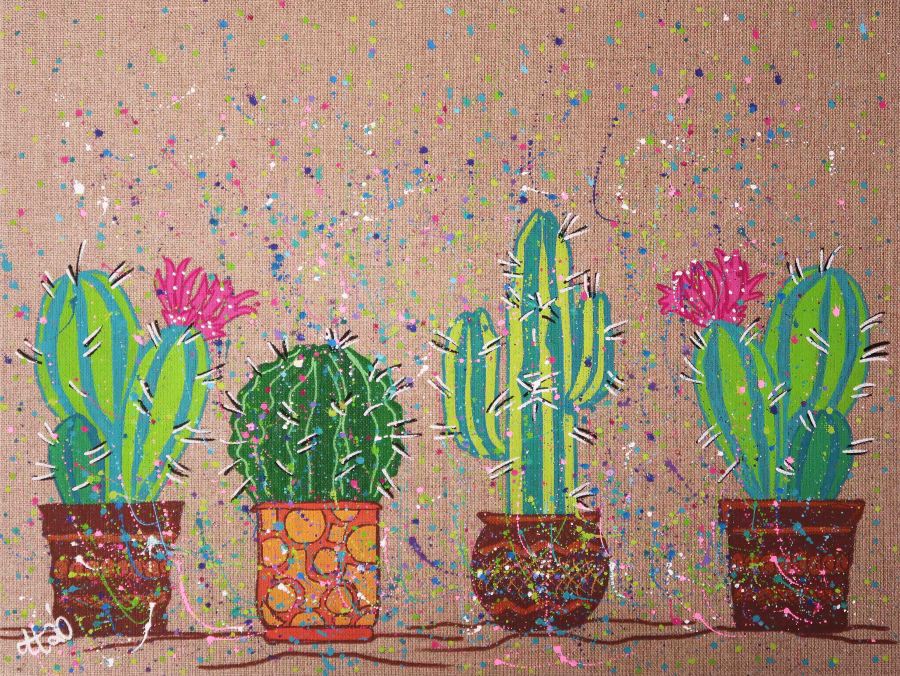 „Kaktus..eee“, 30×40, Acrylfarbe, Acrylstifte, Acrylspray, Glitzerfarbe und Streuglitzer auf schwarzer Malpappe, Preis auf Anfrage.