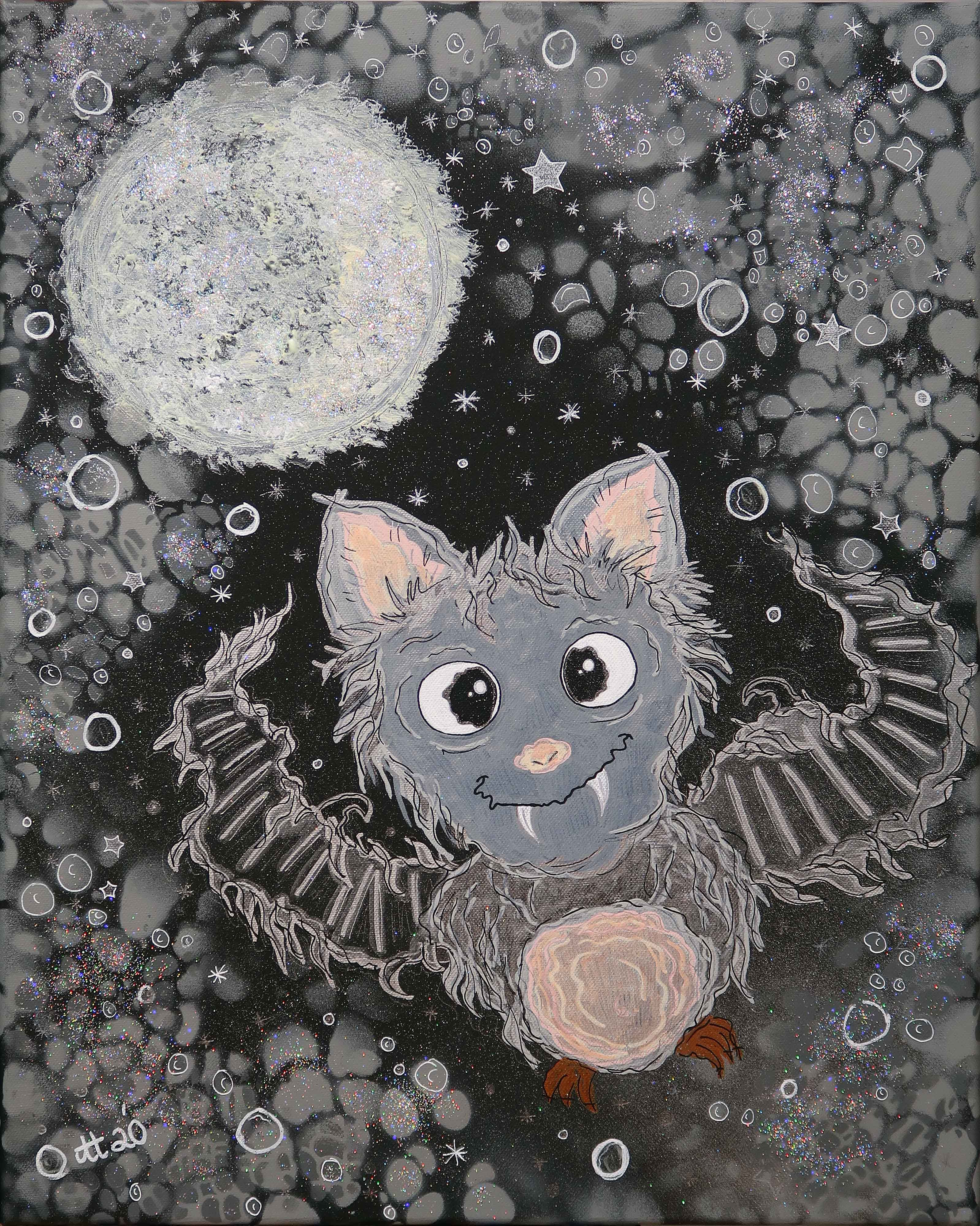 „Flappi Fledermaus“, 40×50, Acrylfarbe, Acrylstifte, Acrylspray, Glitzerfarbe und Streuglitzer auf schwarzer Leinwand , Preis auf Anfrage.