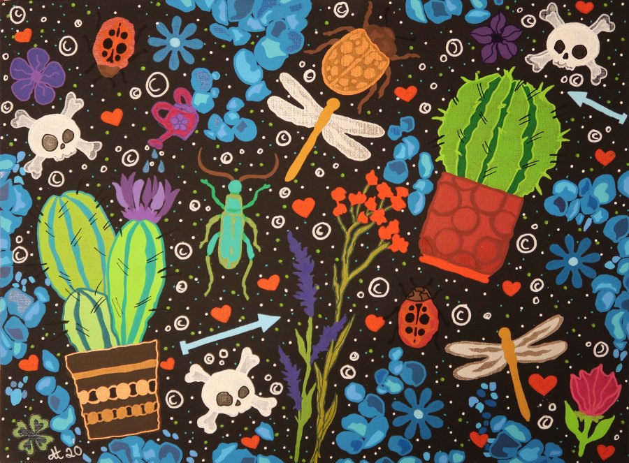 „Gewimmel 2“, 30×40, Acrylfarbe, Acrylstifte, Acrylspray, Glitzerfarbe und Streuglitzer auf schwarzer Malpappe, Preis auf Anfrage.