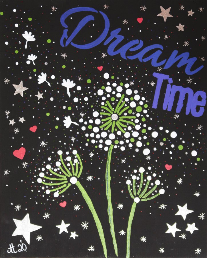 „Dream Time“, 30×40, Acrylfarbe, Acrylstifte, Acrylspray, Glitzerfarbe und Streuglitzer auf schwarzer Malpappe, Preis auf Anfrage.