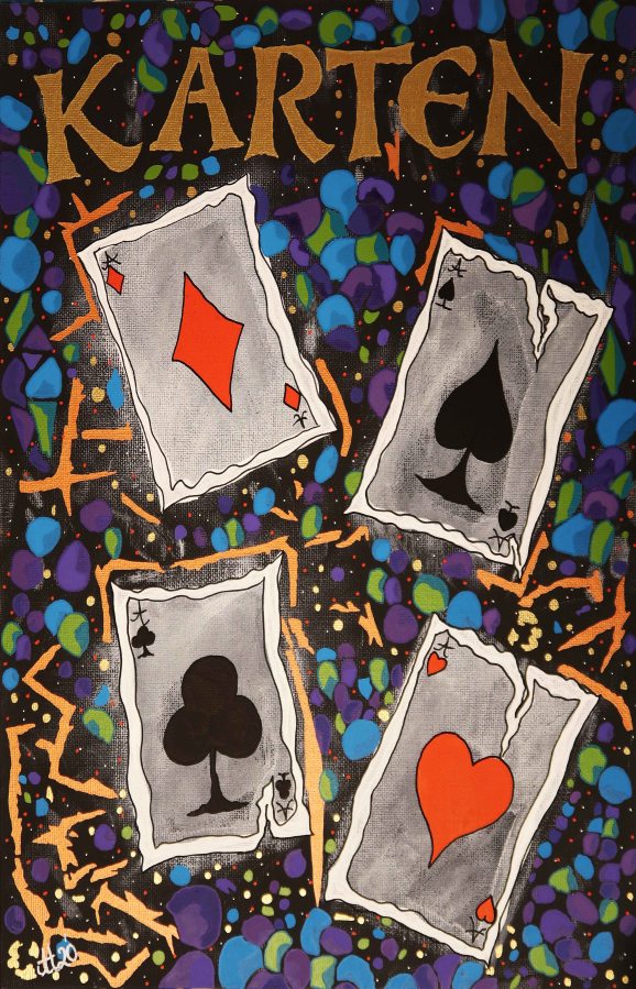 „Karten“, 30×40, Acrylfarbe, Acrylstifte, Acrylspray, Glitzerfarbe und Streuglitzer auf schwarzer Malpappe, Preis auf Anfrage.