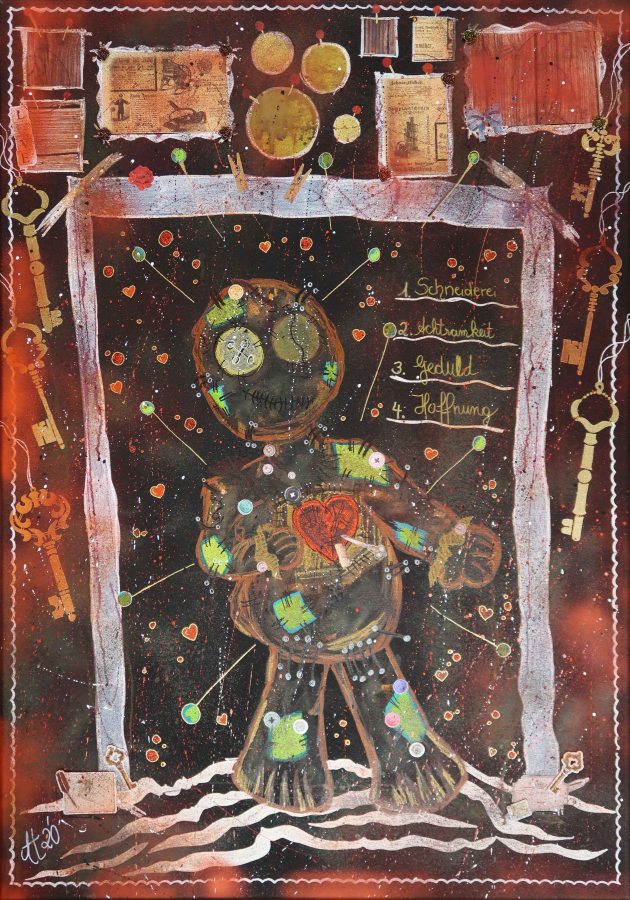 „Auf Bestellung“, 80×100, Acrylfarbe, Acrylstifte, Acrylspray, Glitzerfarbe und Streuglitzer auf schwarzer Leinwand, Preis auf Anfrage.