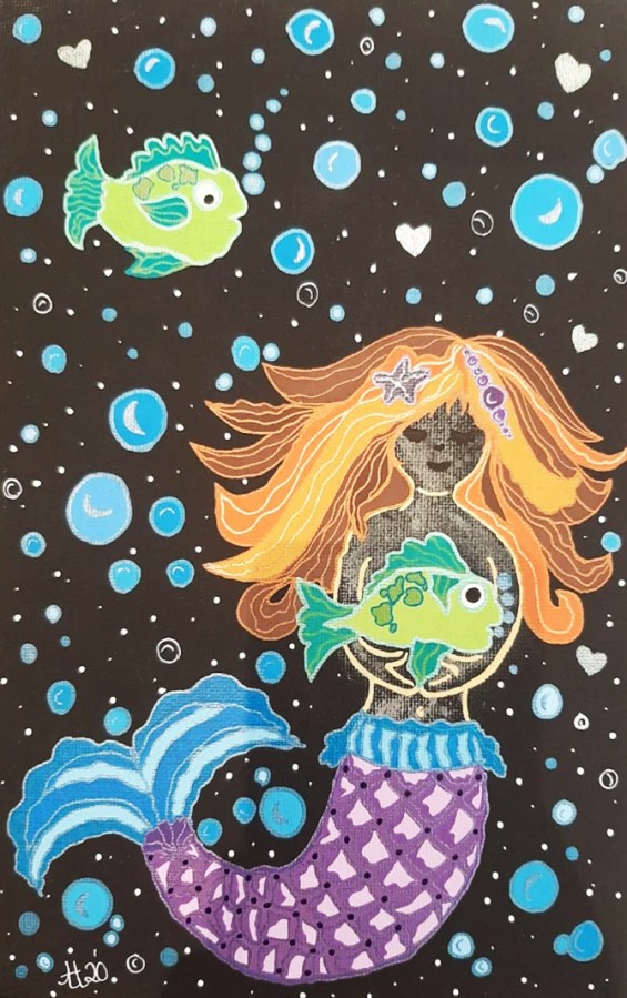 „Kleine Meerjungfrau“, 20×30, Acrylfarbe, Acrylstifte, Acrylspray, Glitzerfarbe und Streuglitzer auf schwarzer Malpappe, Unverkäuflich.