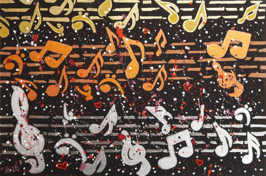 „Vertraute Klänge“, 20×30, Acrylfarbe, Acrylstifte, Acrylspray, Glitzerfarbe, Pailletten und Streuglitzer auf schwarzem Malkaton, Preis auf Anfrage.