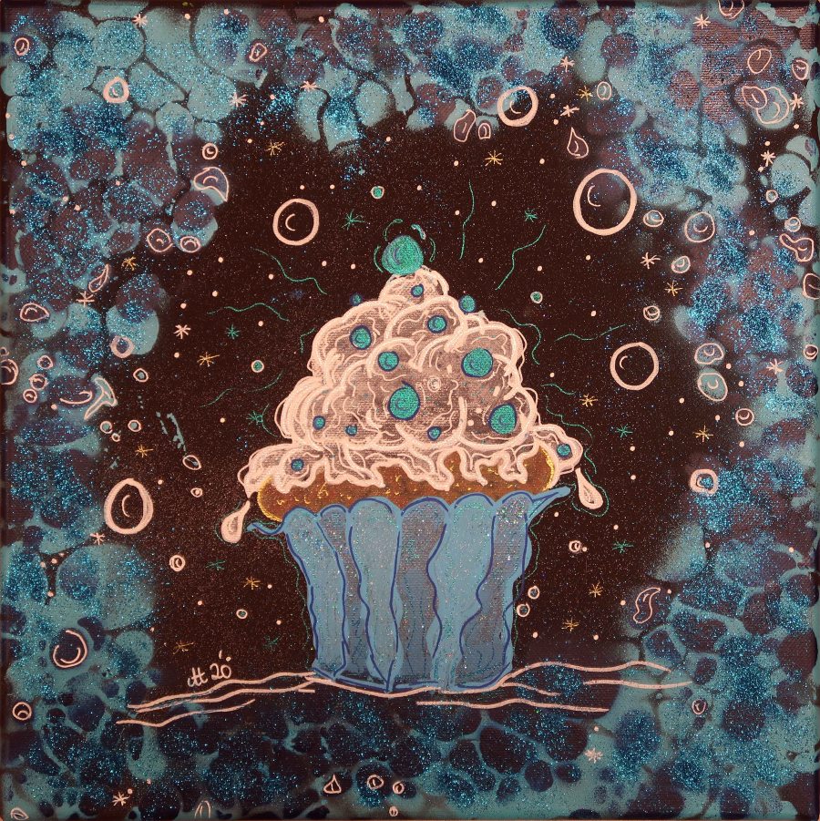 „Die KLEINEN Feinen blau“, 30×30, Acrylfarbe, Acrylstifte, Acrylspray, Glitzerfarbe und Streuglitzer auf schwarzer Leinwand , Preis auf Anfrage.