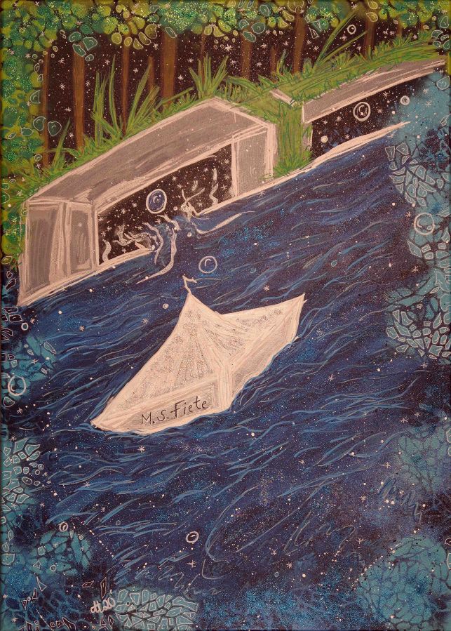 „Kurzer Gruss von Früher“, 50×70, Acrylfarbe, Acrylstifte, Acrylspray, Glitzerfarbe und Streuglitzer auf schwarzer Leinwand , Preis auf Anfrage.