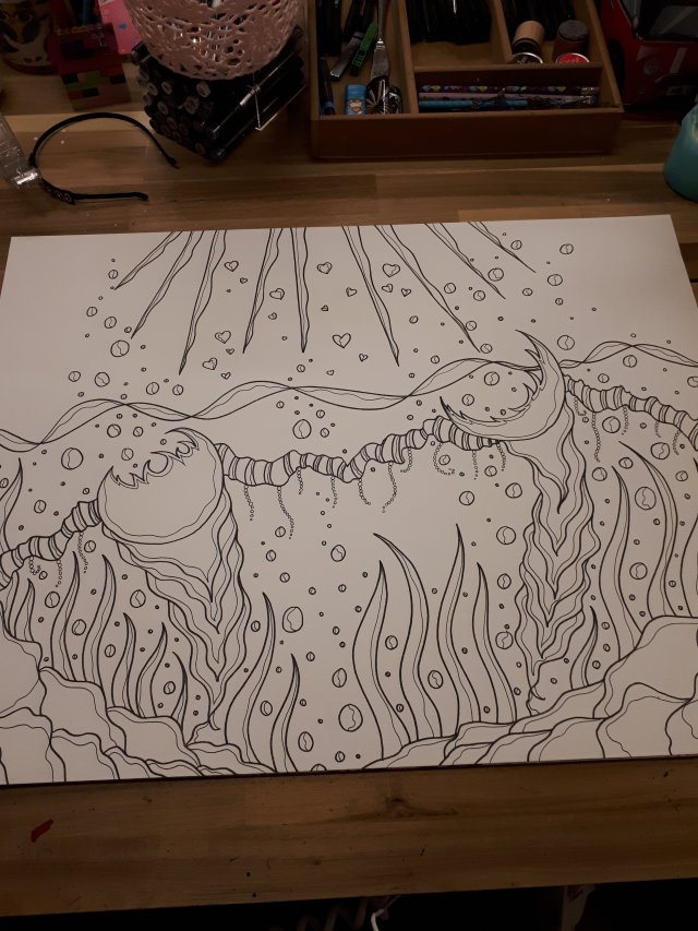 „Der muränige Gustav“, 50×60, Acrylfarbe, Acrylstifte, Acrylspray, Glitzerfarbe und Streuglitzer auf schwarzer Leinwand , Preis auf Anfrage.