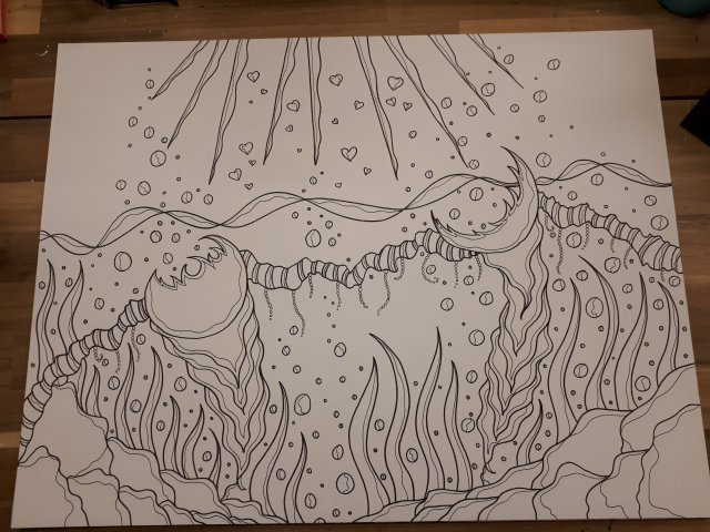 "Der muränige Gustav", 50x60, Acrylfarbe, Acrylstifte, Acrylspray, Glitzerfarbe und Streuglitzer auf schwarzer Leinwand , Preis auf Anfrage.