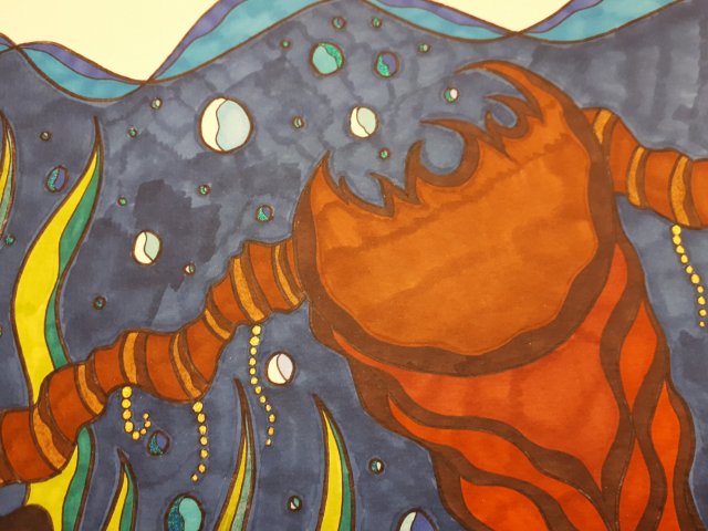 „Der muränige Gustav“, 50×60, Acrylfarbe, Acrylstifte, Acrylspray, Glitzerfarbe und Streuglitzer auf schwarzer Leinwand , Preis auf Anfrage.