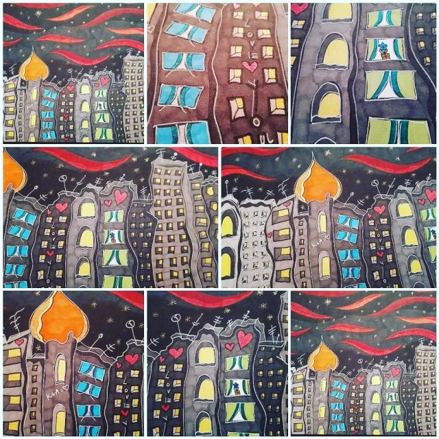 "Vertraute Lichter", 50x70, Acrylfarbe, Acrylstifte, Acrylspray, Glitzerfarbe und Streuglitzer auf schwarzer Leinwand , Preis auf Anfrage.