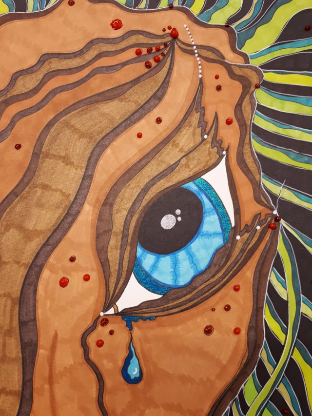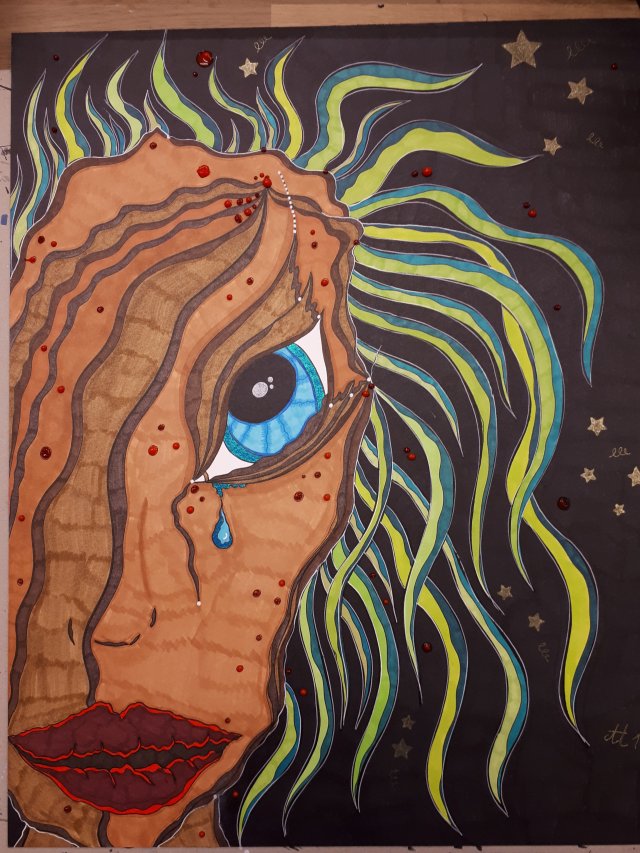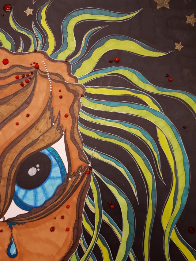 "Das ANDERS-TIER im Sternenhimmel", 60x80, Acrylfarbe, Acrylstifte, Acrylspray, Glitzerfarbe und Streuglitzer auf schwarzer Leinwand , unverkäuflich.