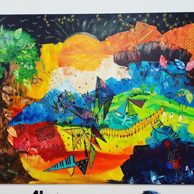 „Ein Stück Heimat 2“, 60×80, Acrylfarbe, Acrylstifte, Acrylspray, Glitzerfarbe und Streuglitzer auf schwarzer Leinwand , Preis auf Anfrage.