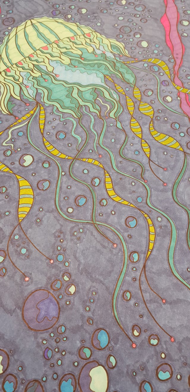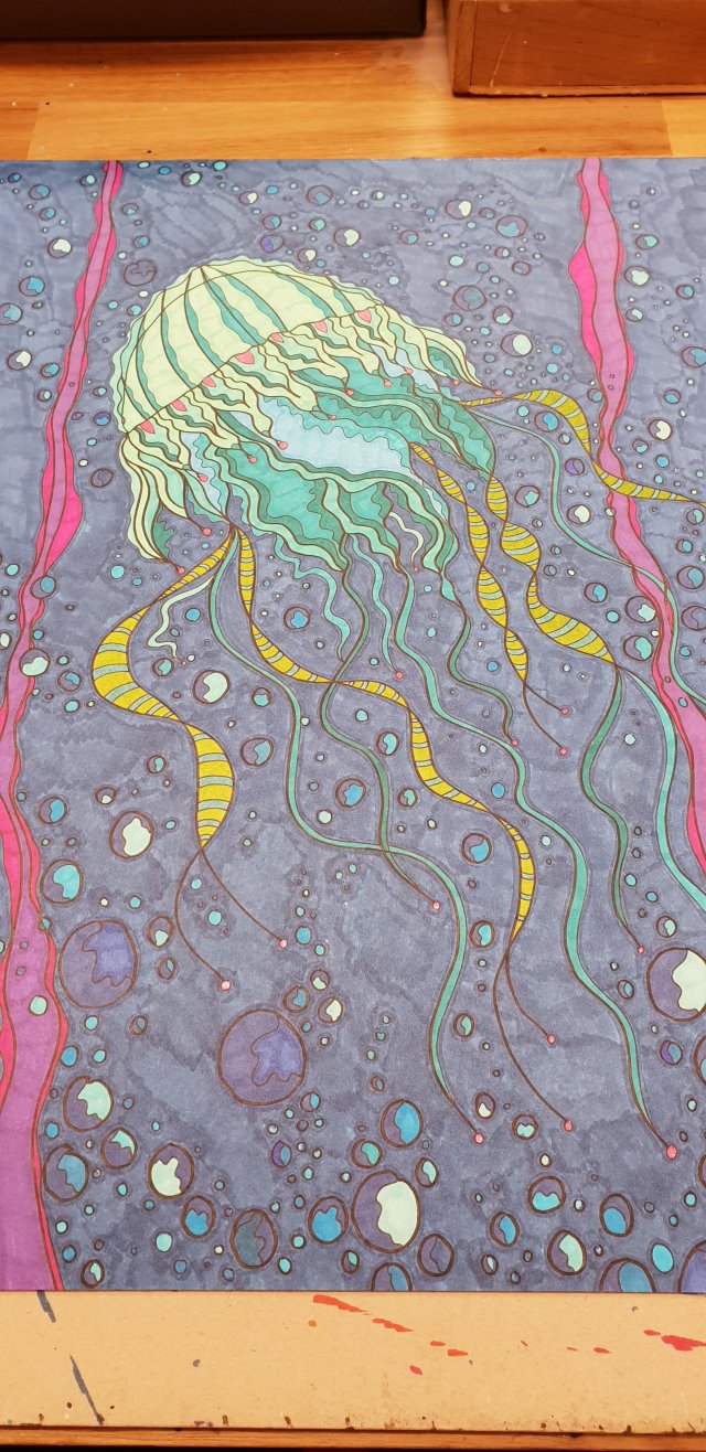 Die erste Qualle ist fertig coloriert… Morgen folgen die Details… Diverse Künstlerstiften auf Aquarell Papier Noch in Arbeit Made bye Kunst mal anders Masse: 40,6×50,8