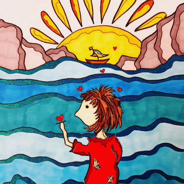 „ESVBM Liebe“, 40×30, Acrylfarbe, Acrylstifte, Acrylspray, Glitzerfarbe und Streuglitzer auf schwarzer Malpappe, Preis auf Anfrage.