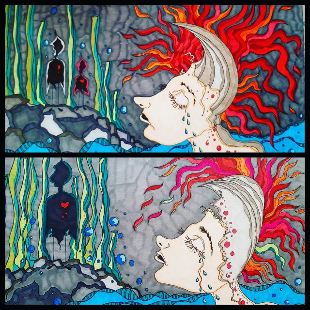 "Unterm Horizont", 2x50x60, Acrylfarbe, Acrylstifte, Acrylspray, Glitzerfarbe und Streuglitzer auf schwarzer Leinwand , Preis auf Anfrage.