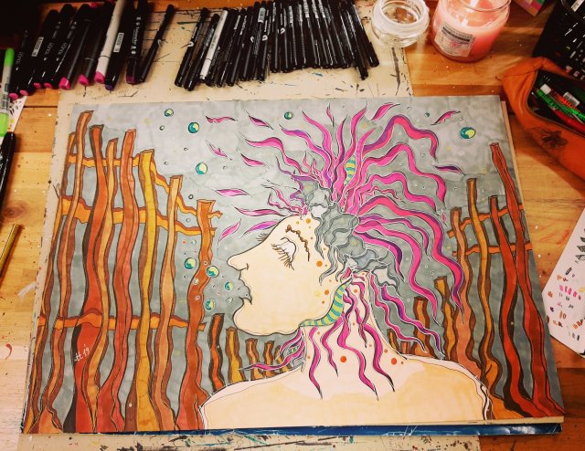 "Gehalten im Nirgendwo", 80x100, Acrylfarbe, Acrylstifte, Acrylspray, Glitzerfarbe und Streuglitzer auf schwarzer Leinwand , Preis auf Anfrage.