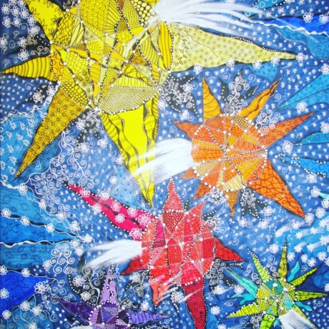 GUTEN ABEND ihr Lieben… Vor 4 Jahren entstand dieses Werk , zu meiner Anfangszeit… Es war und ist eins meiner Lieblingswerke… Inzwischen habe ich,mit klrinen Änderungen, 2 verkauft… Es ist als Postkarte gedruckt und in der Kunst mal Anders Familie zu Hause… Titel: Sternenhimmel Grösse: 54×65 cm Künstlerstifte aller Art,Acrylstifte und Gel Pens auf 300g Mixed Media Papier Jetzt wie damals, Idee und Umsetzung made/by Kunst mal Anders