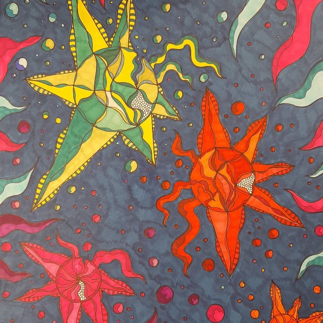 "ESVBM Nachts", 40x30, Acrylfarbe, Acrylstifte, Acrylspray, Glitzerfarbe und Streuglitzer auf schwarzer Malpappe, Preis auf Anfrage.