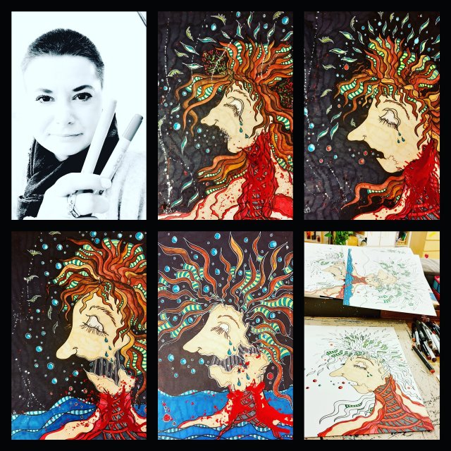 „MUT ZUM HÄSSLICHEM…MUT ZUM VER-MALEN…MUT zu ZEIGEN das NICHT jede KREATIVITÄT SCHÖN sein KANN oder MUSS…“ Geschafft… 4 Bilder…ein Gesamtwerk Titel: Schmerzhaftes Schweigen Künstlertusche und Pigment Liner,Acrylstifte und Acrylspray, Gel Pens mancher Art auf 300g Mixed Media Papier Wie immer, Idee und Umsetzung Original made/by Kunst mal Anders