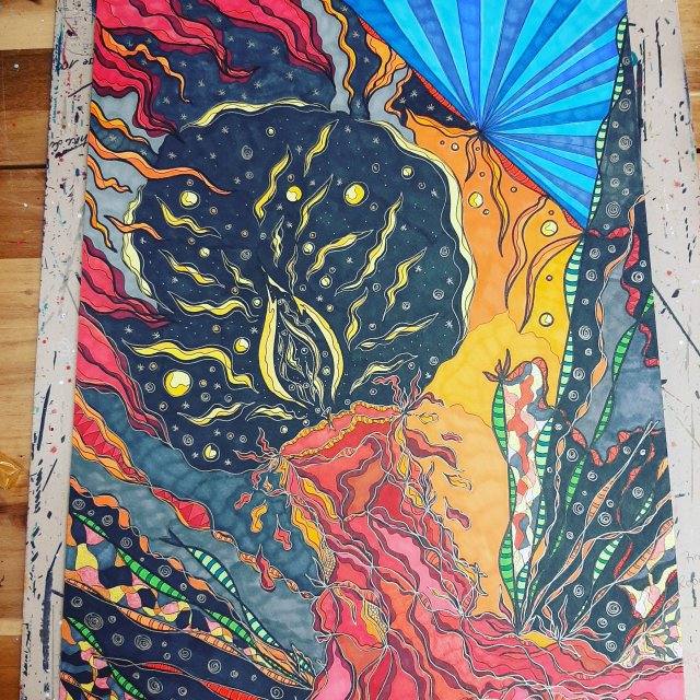 „Unterm Horizont“, 2x50x60, Acrylfarbe, Acrylstifte, Acrylspray, Glitzerfarbe und Streuglitzer auf schwarzer Leinwand , Preis auf Anfrage.
