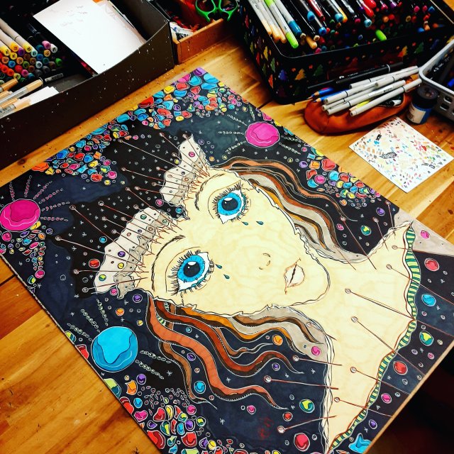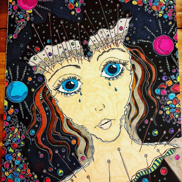 „ESVBM Prinzessin“, 20×20, Acrylfarbe, Acrylstifte, Acrylspray, Glitzerfarbe und Streuglitzer auf schwarzer Malpappe, Preis auf Anfrage.