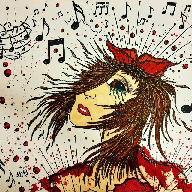 „ESVBM Prinzessin“, 20×20, Acrylfarbe, Acrylstifte, Acrylspray, Glitzerfarbe und Streuglitzer auf schwarzer Malpappe, Preis auf Anfrage.