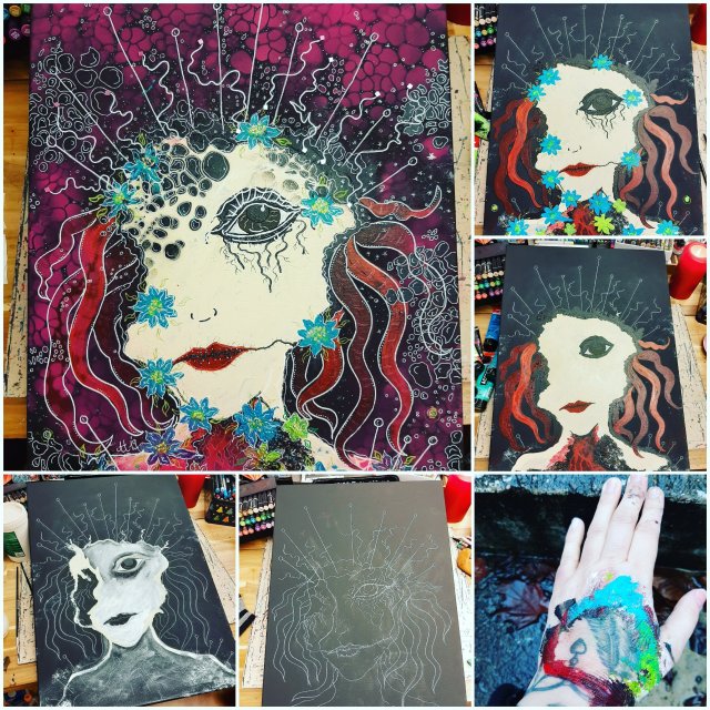 "Ich träume ANDERS", 80x100, Acrylfarbe, Acrylstifte, Acrylspray, Glitzerfarbe und Streuglitzer auf schwarzer Leinwand , verkauft.