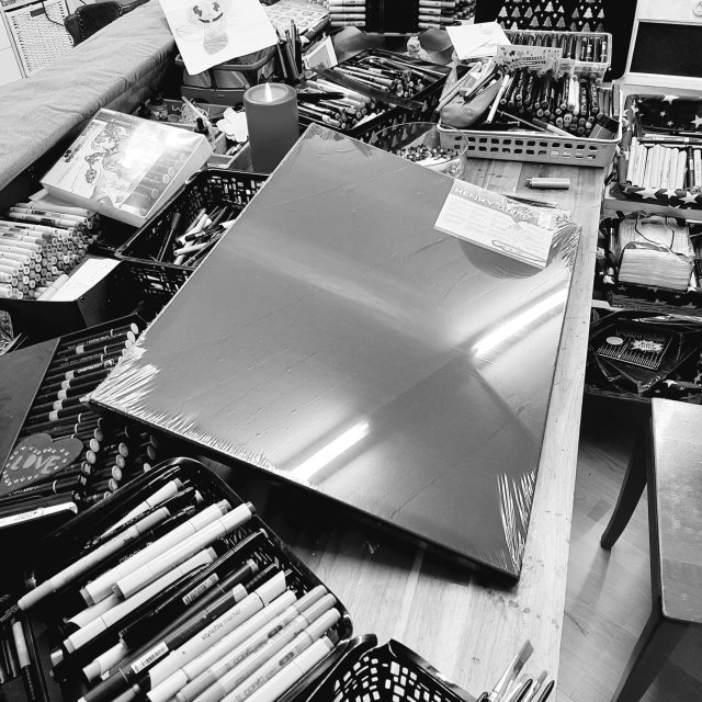 „147“, 30×30, Acrylfarbe, Acrylstifte, Acrylspray, Glitzerfarbe und Streuglitzer auf schwarzer Malpappe, unverkäuflich.