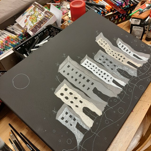 "Vertraute Lichter", 50x70, Acrylfarbe, Acrylstifte, Acrylspray, Glitzerfarbe und Streuglitzer auf schwarzer Leinwand , Preis auf Anfrage.