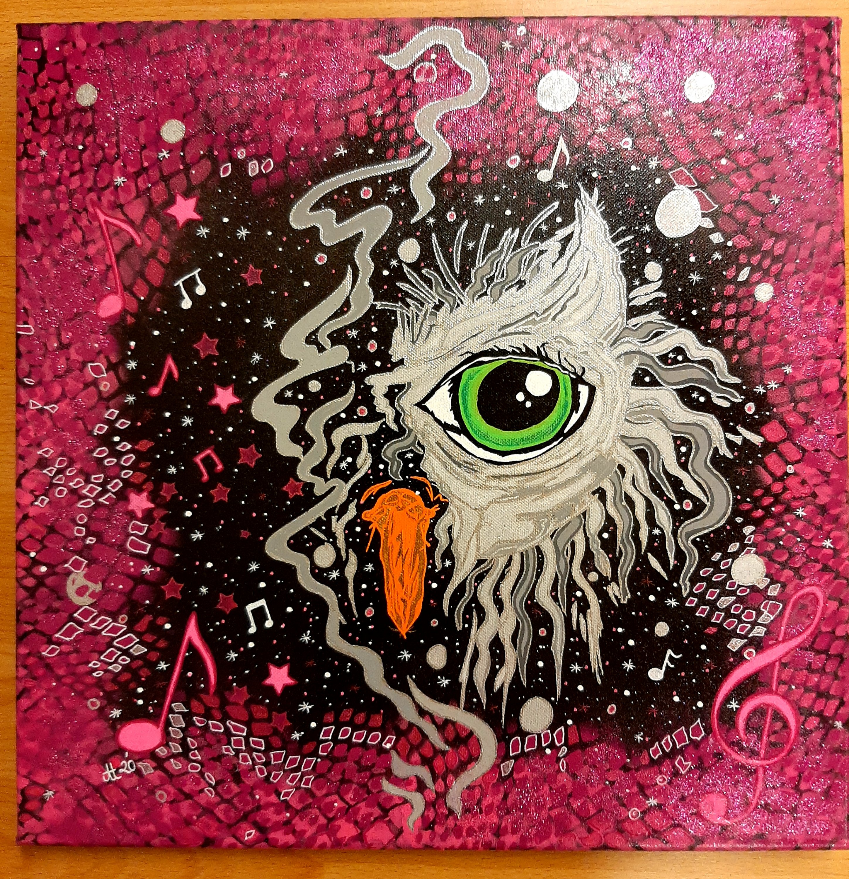 Acrylfarbe, Acrylstifte, Acrylspray, Glitzerfarbe und Streuglitzer auf schwarzer Leinwand