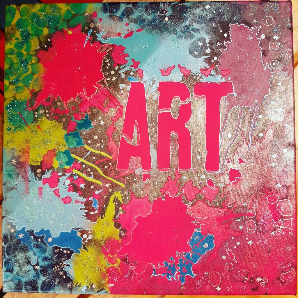 Acrylfarbe, Acrylstifte, Acrylspray, Glitzerfarbe und Streuglitzer auf schwarzer Leinwand