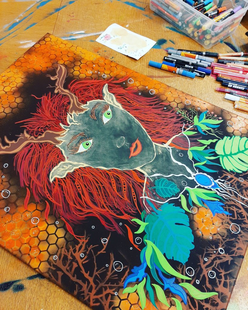 Bisher Acrylspray und Acrylstifte auf schwarzer Leinwand