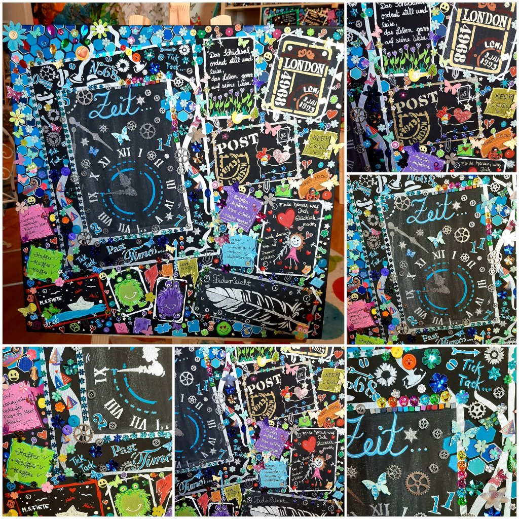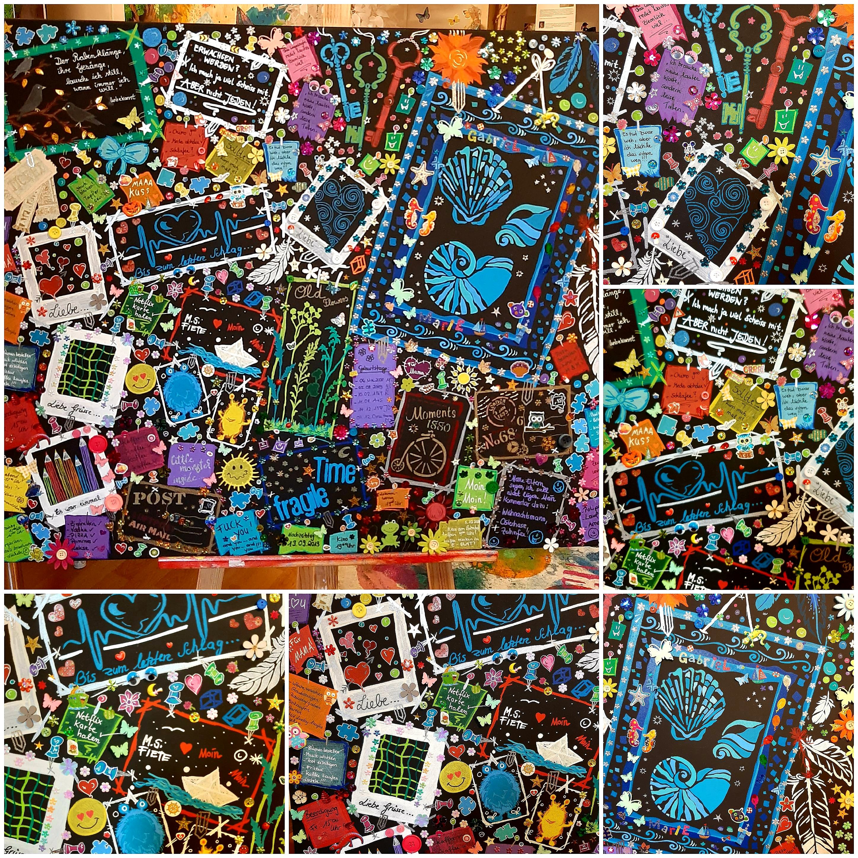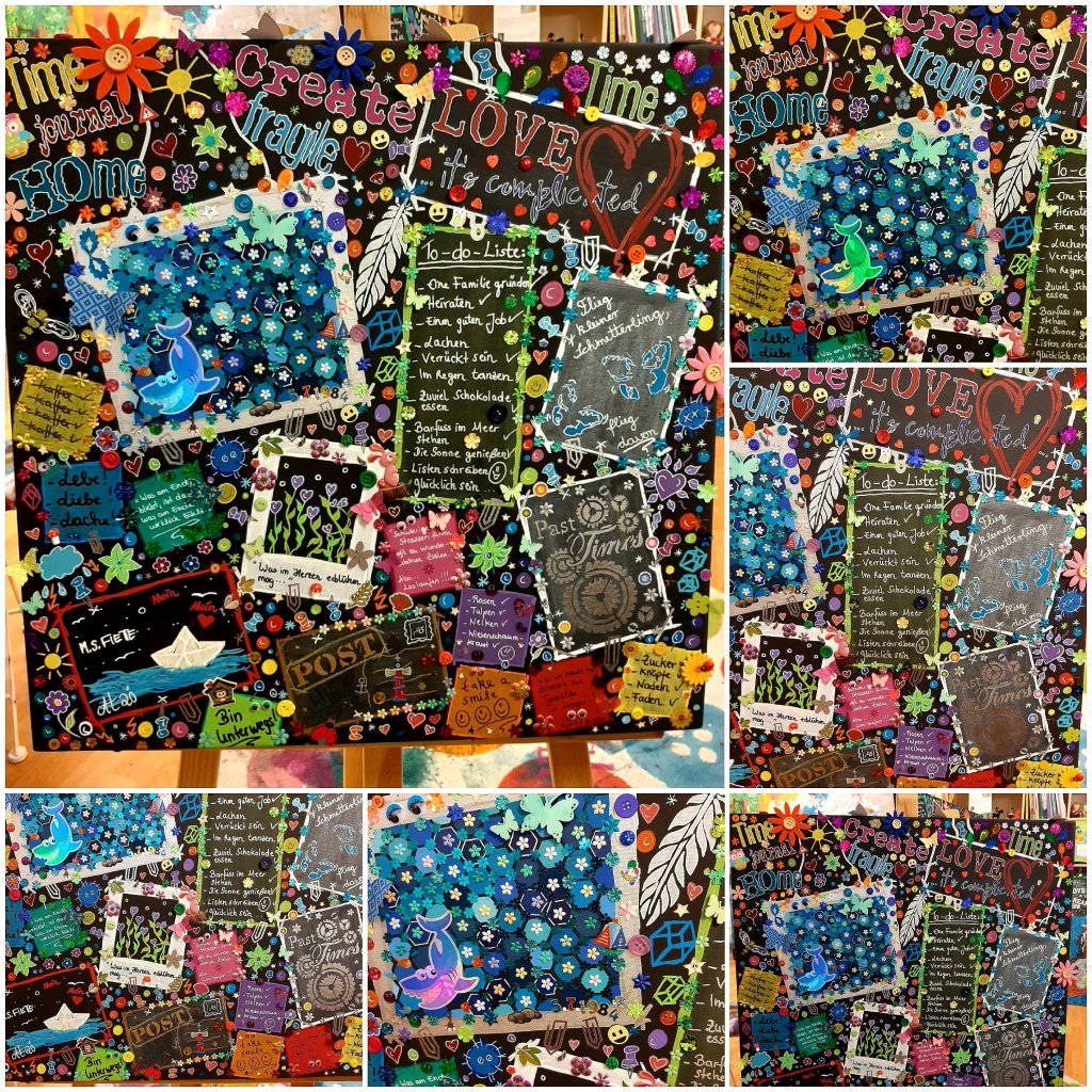 Mixedmedia: Acrylstifte, Streupailletten,Sticker,Knöpfe und Gestanztes Papier auf schwarzen Leinwänden