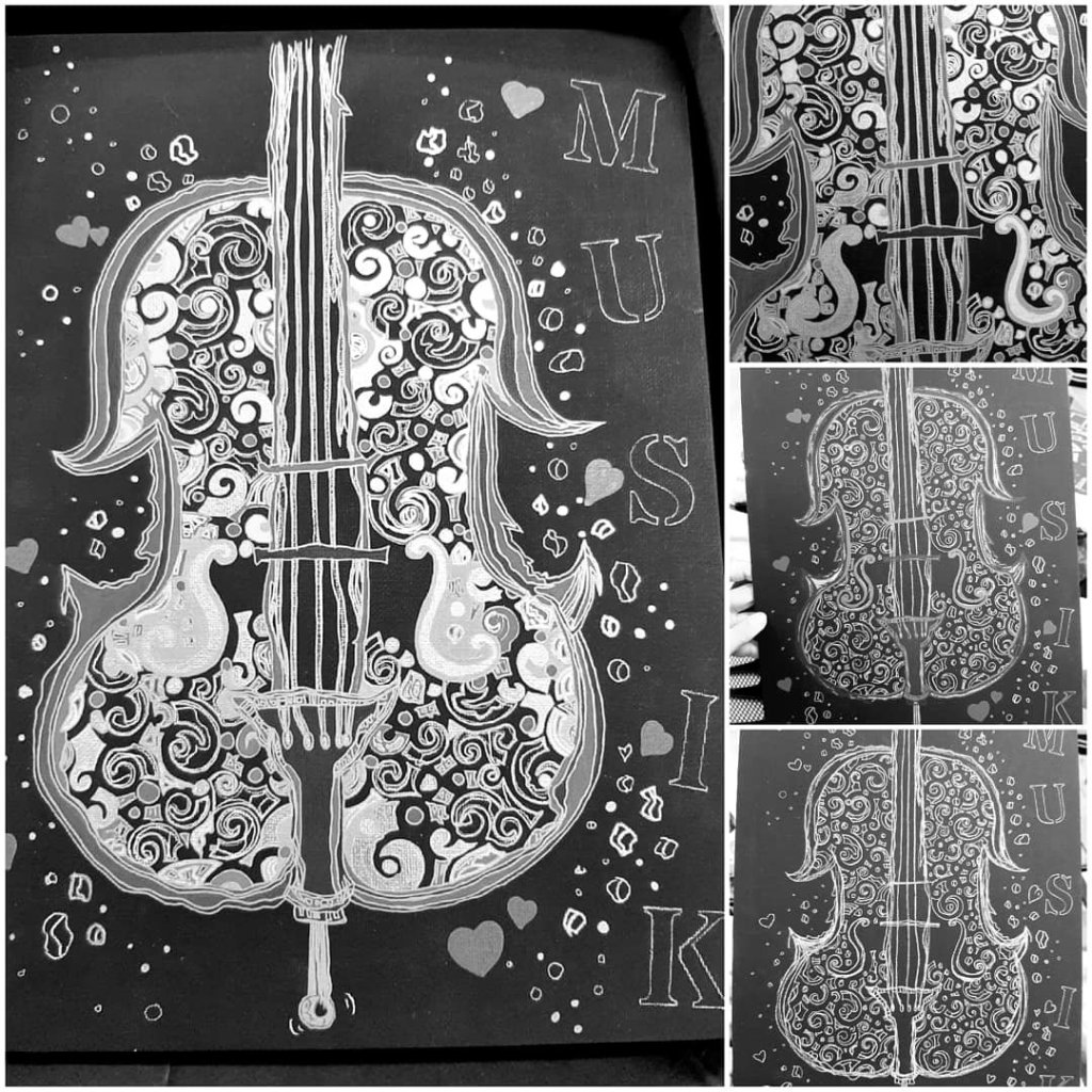 Bisher Acrylstifte und Grafik Liner auf schwarzer Malpappe