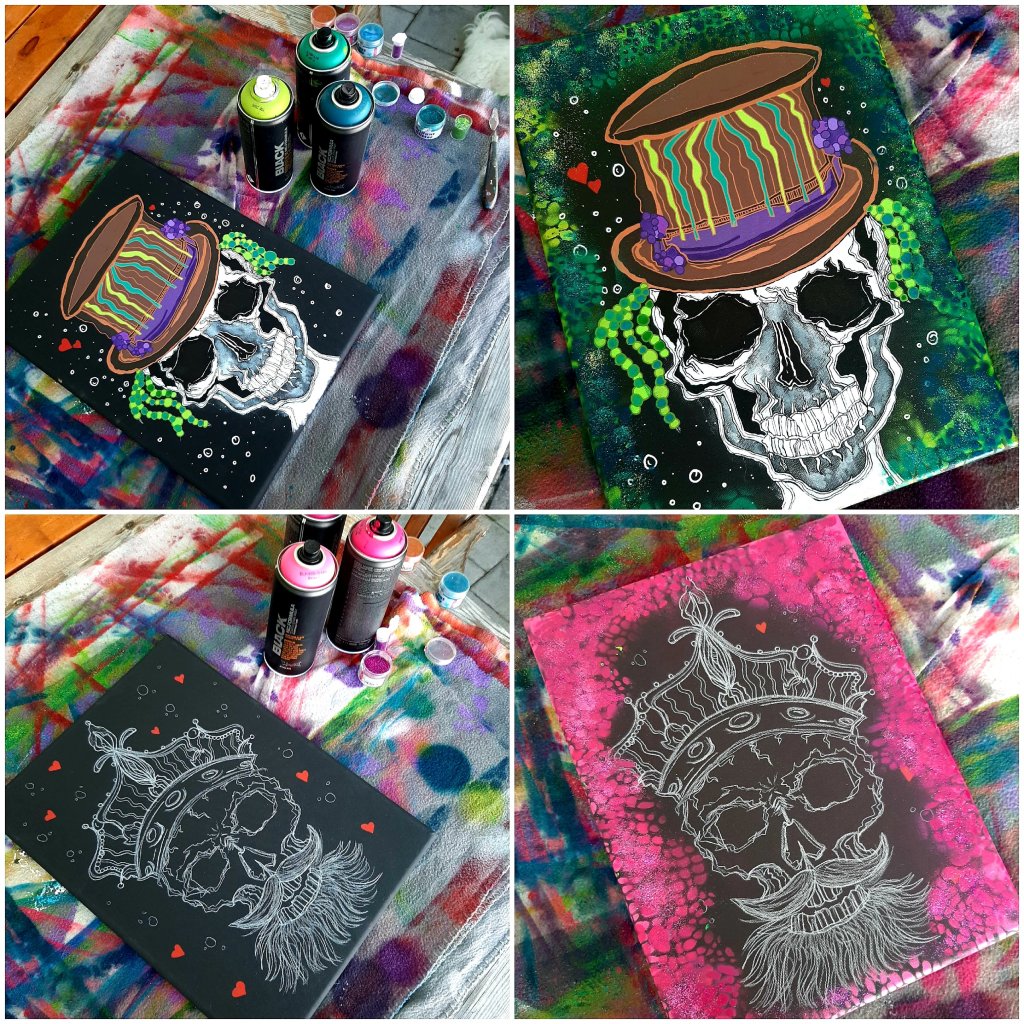 Bisher Acrylstifte, Grafik Liner,Streuglitzer und Acrylspray auf schwarzer Leinwand