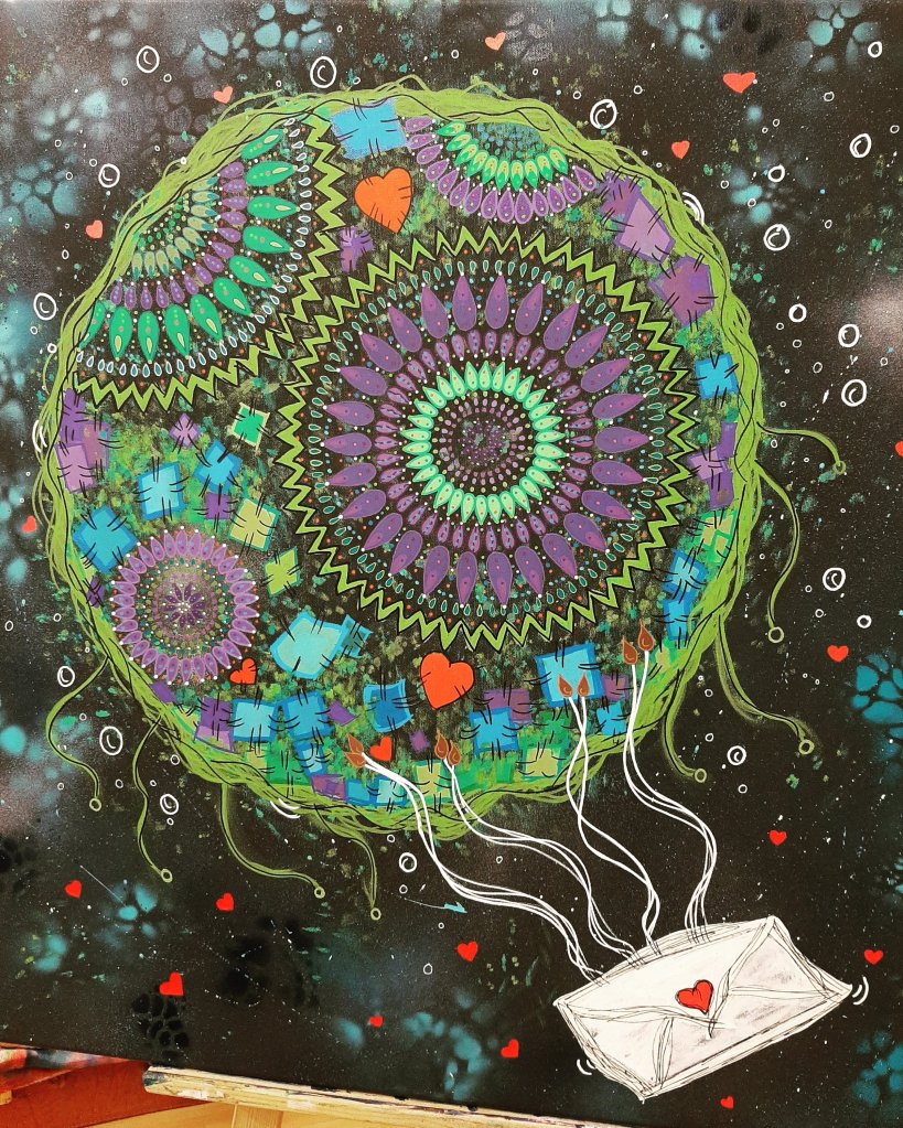 Bisher Acrylspray, Acrylstifte und Streuglitzer auf schwarzer Leinwand