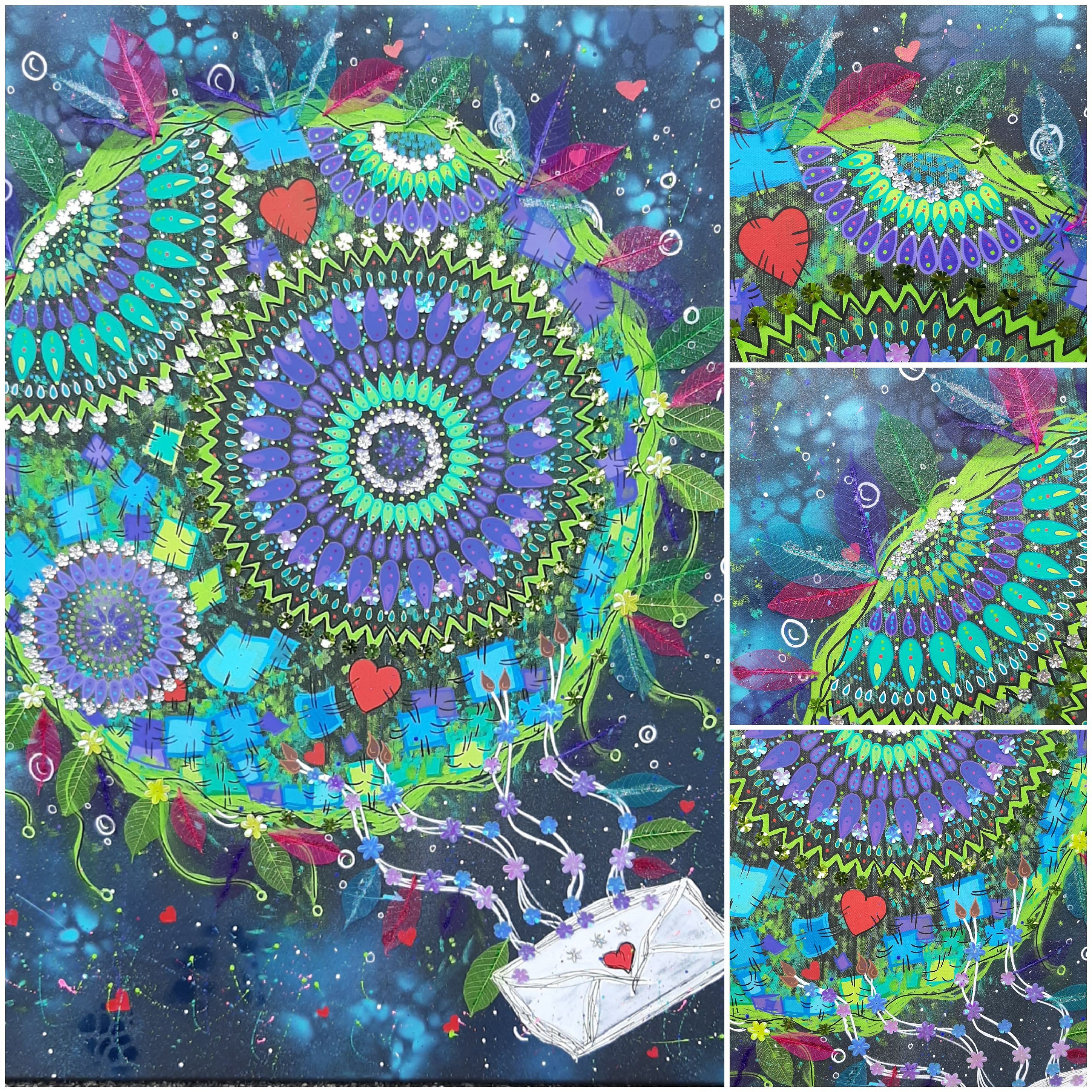 Acrylspray, Acrylstifte, Grafik Liner und Goldmarker,sowie verschiedene Pailletten und Skelettblätter auf schwarzer Leinwand