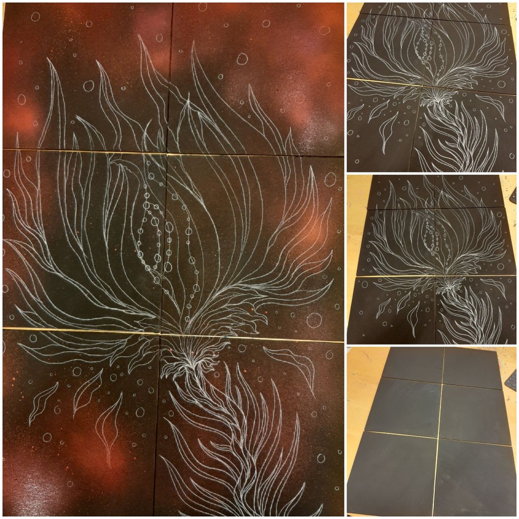 Bisher Acrylspray und Skizzierstift auf schwarzer Malpappe