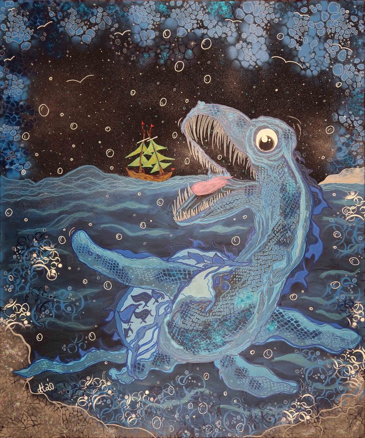 „COROnessy“, 100×120, Acrylfarbe, Acrylstifte, Acrylspray, Glitzerfarbe und Streuglitzer auf schwarzer Leinwand , Preis auf Anfrage.
