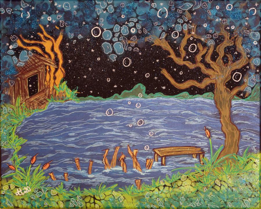 „Inne halten“, 40×50, Acrylfarbe, Acrylstifte, Acrylspray, Glitzerfarbe und Streuglitzer auf schwarzer Leinwand , Preis auf Anfrage.