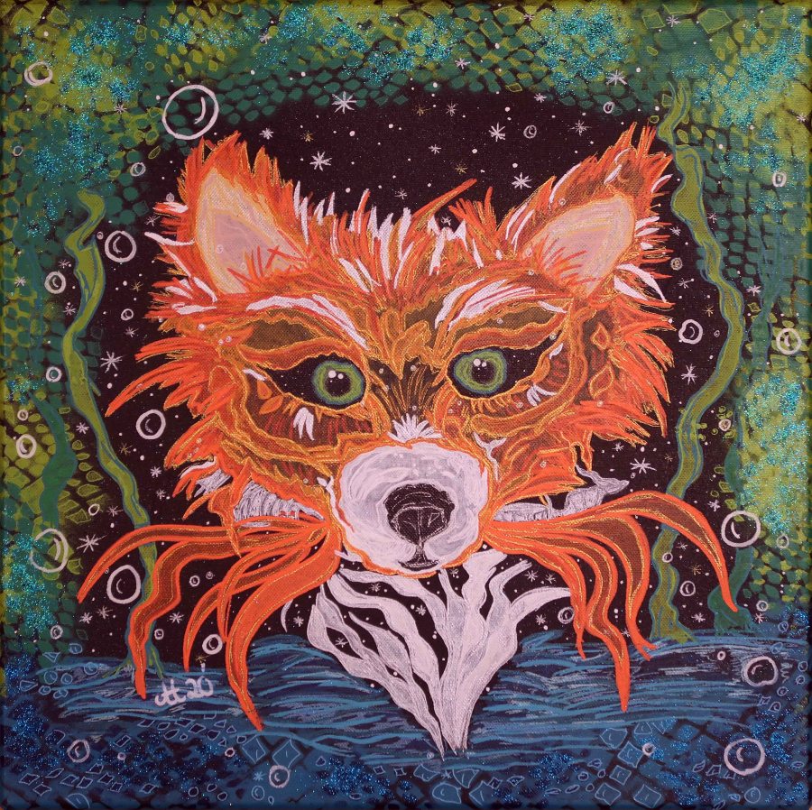 „Friedrich von Schlaufuchs“, 40×40, Acrylfarbe, Acrylstifte, Acrylspray, Glitzerfarbe und Streuglitzer auf schwarzer Leinwand , Preis auf Anfrage.