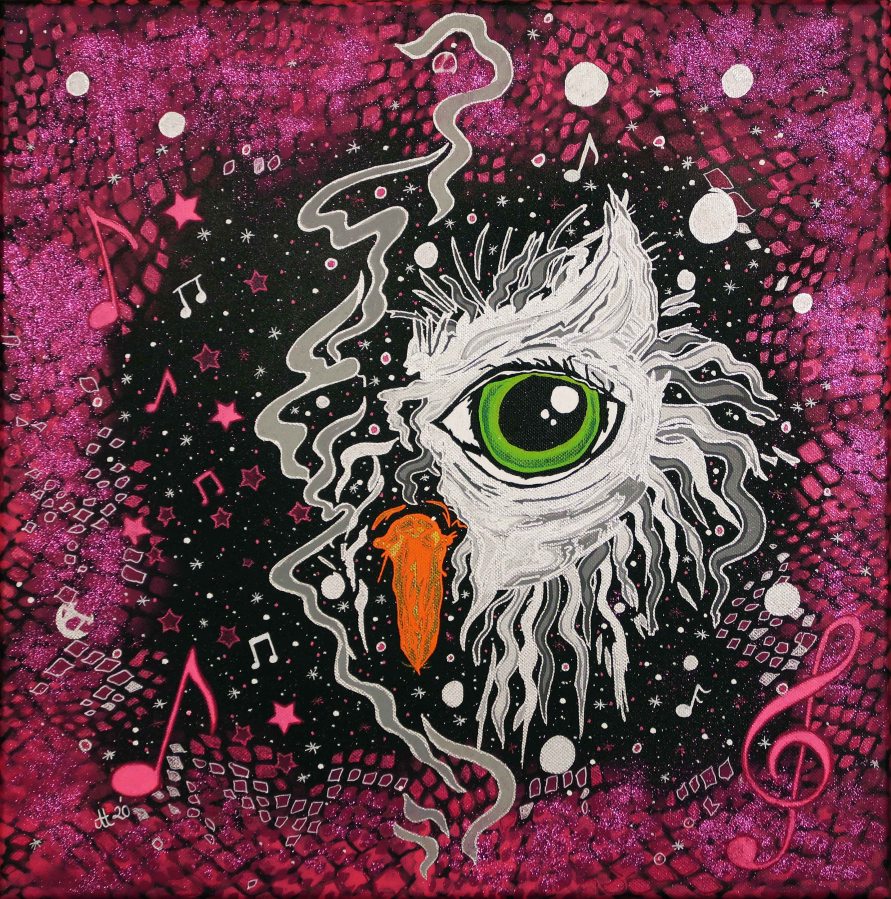 „Kleine Nachtmusik“, 40×40, Acrylfarbe, Acrylstifte, Acrylspray, Glitzerfarbe und Streuglitzer auf schwarzer Leinwand , Preis auf Anfrage.